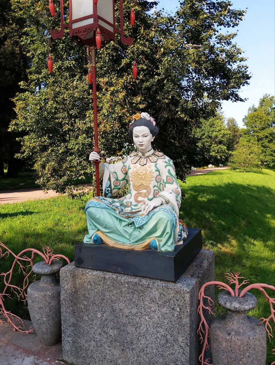 Парк с живописными аллеями сохранил аутентичные интерьеры, он разделен на несколько зон. Верхний сад примыкает к Большому дворцу, оформлен в регулярном стиле с аллеями и цветниками. Нижний парк — пейзажный с прудами и мостиками. Павильон Катальной горки окружен декоративными насаждениями. Также есть Китайский сад с экзотическими растениями. Одним словом, если вы решите поехать погулять сюда из Питера, также закладывайте день.